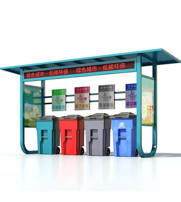 設有擋雨棚,可配備垃圾箱信息顯示屏、防水照明燈、廣告屏,進行地面硬化。對社區玻金塑紙可回收物,其他垃圾,廚余垃圾,有害垃圾等生活垃圾定時定點投放收集.